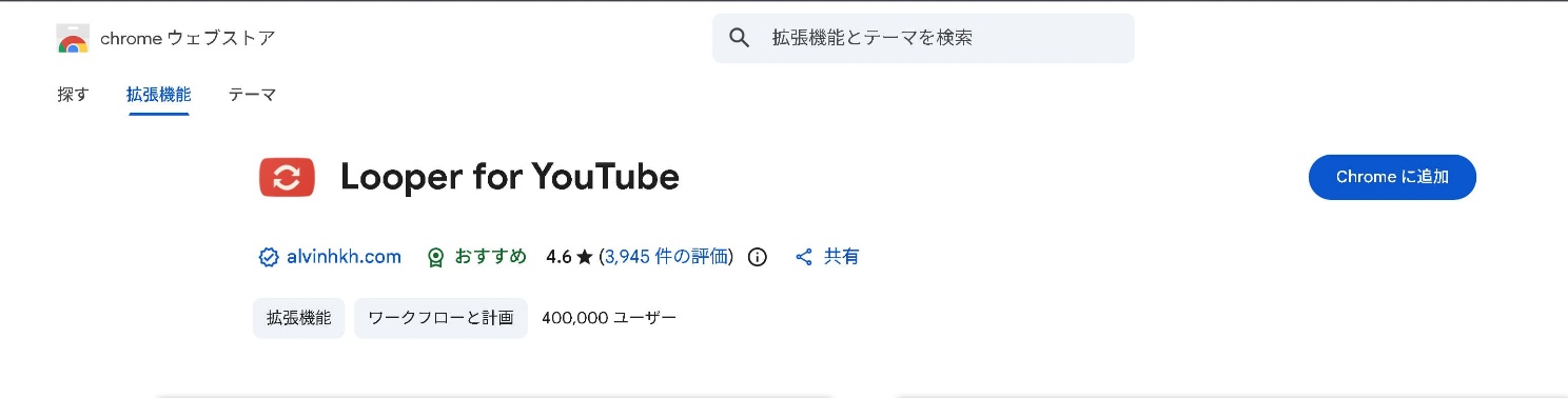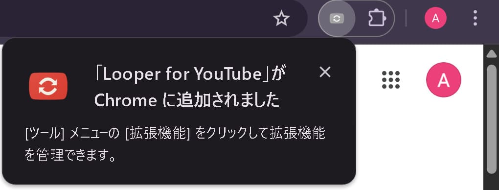 ブラウザの右上に「Looper for YouTubeがChromeに追加されました」と表示されれば完了です。