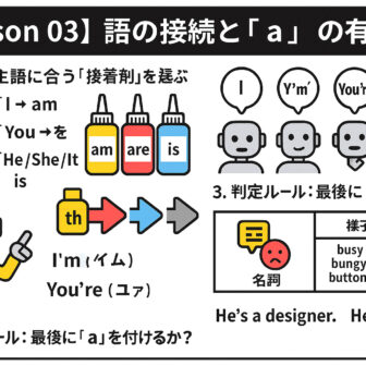【Lesson 03 仕様書:主語の接続と「a」の有無】1. 操作:主語に合う「接着剤」を選ぶ英語は、主語によって使うbe動詞が物理的に決まっています。• If 主語が…